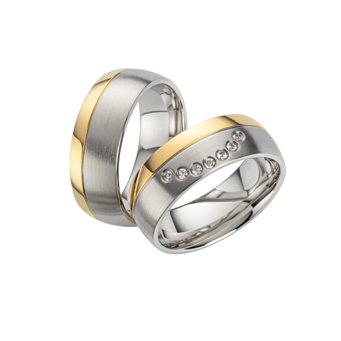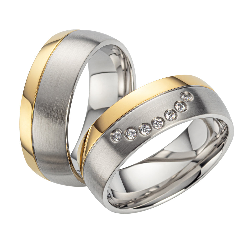 Die Kombination aus silber- und goldfarbenen, mattierten sowie polierten Oberflächen sorgt für einen hochwertigen Kontrast und unterstreicht die moderne Optik des Ringpaares.
