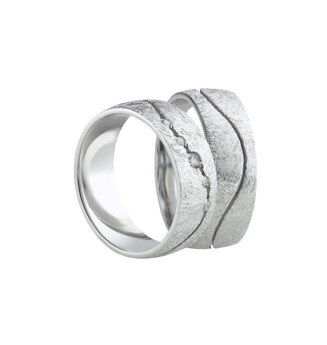 Im Damenring sorgen fünf Zirkonia, eingefasst in einem wellenförmigen Kanal, für lebendige Lichtreflexe und eine besondere Dynamik. Der Herrenring greift die markante Linienführung ohne Steinbesatz auf und ergänzt das Ringpaar harmonisch.