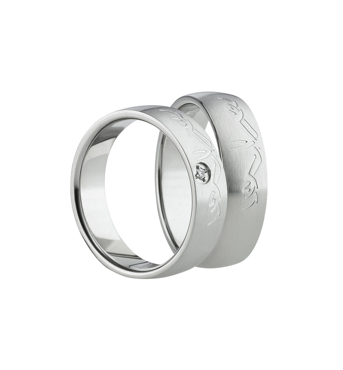 Gefertigt aus hochwertigem Titan, überzeugen die Ringe durch ihr geringes Gewicht, ihre hohe Widerstandsfähigkeit und den angenehmen Tragekomfort. Der Damenring wird durch einen funkelnden Zirkonia stilvoll akzentuiert – dezent, elegant und perfekt in das Design integriert.